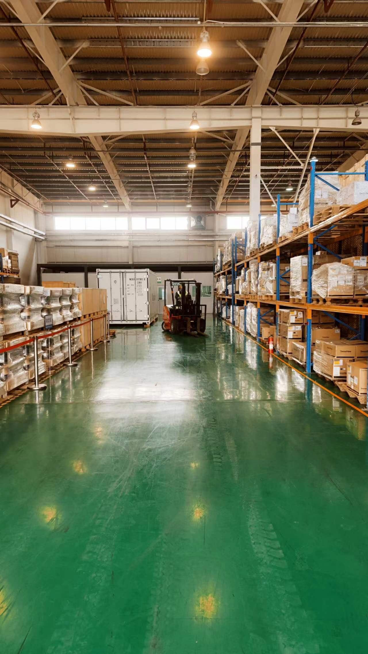 The warehouse adopts a special hardened multifunctional floor and is equipped with multi-layer vertical shelves, power forklifts, environmentally friendly manual forklifts and other loading and unloading equipment